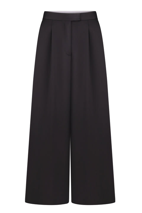 Wide trousers made of fine Italian wool with pockets and loops for a belt. Bodice ribbon on the waste line, fully hand-made, clips for fastening.